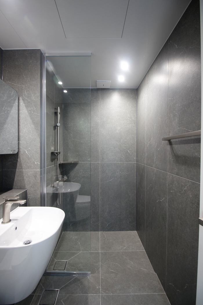 ÀÚ¿¬½º·¯¿î ÆÐÅÏÀÌ µ¸º¸ÀÌ´Â Áø±×·¹ÀÌ ¹«±¤ Ä÷¯¸¦ ¼±ÅÃÇß½À´Ï´Ù. ƯÈ÷ º®¸é¿¡ ½Ã°øµÈ 1200*600 ´ëÇü »çÀÌÁî´Â ÁÙ´«À» ÃÖ¼ÒÈÇØ ¿å½ÇÀÌ ÈξÀ ³Ð¾î º¸À̰í, ¿õÀåÇÑ °í±Þ½º·¯¿òÀ» ¼±»çÇÕ´Ï´Ù.